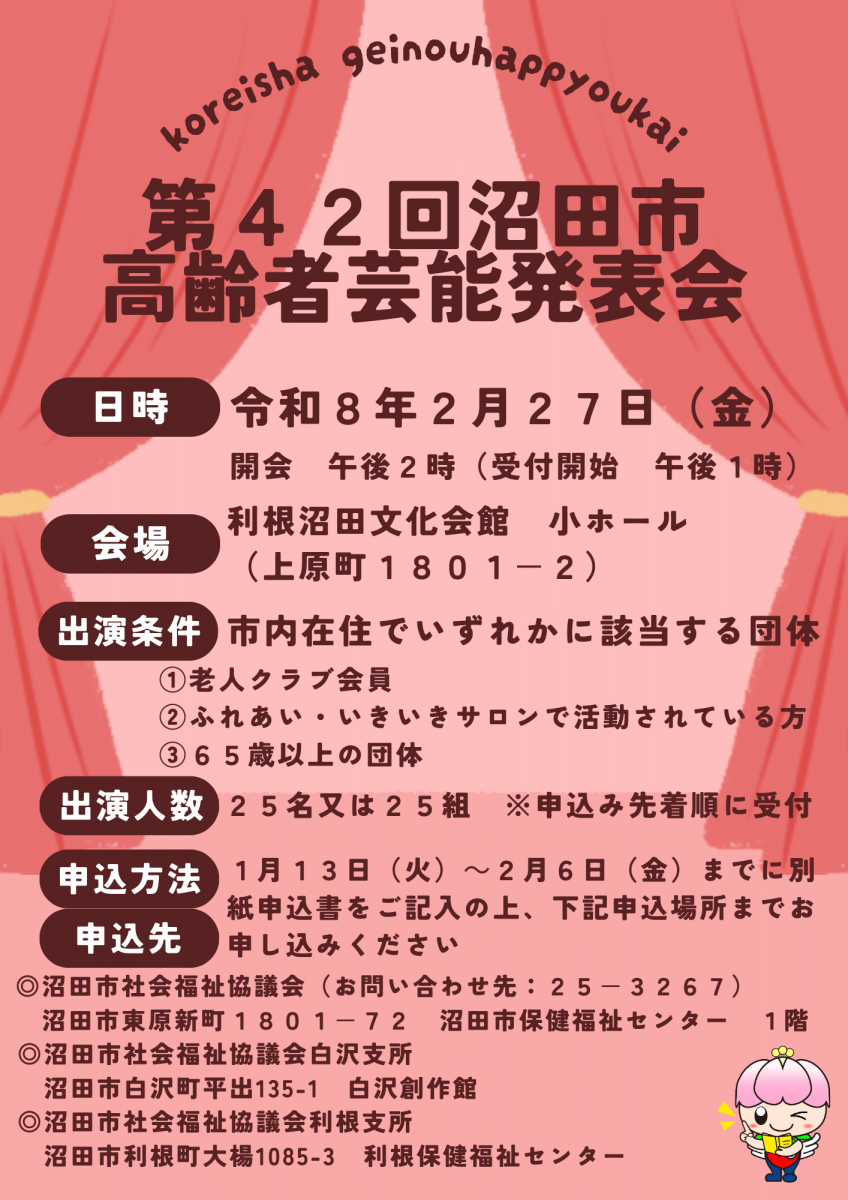 令和8年2月27日(金)午後2時から利根沼田文化会館小ホールにて、第42回沼田市高齢者芸能発表会を開催します。